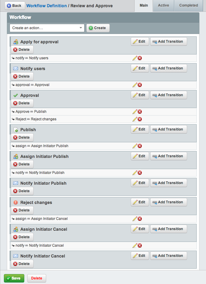 The following example will configure a simple Review and Approve workflow. First, create all your actions to match your desired workflow process and then create the transitions from each action.