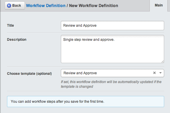 Workflow provides a simple "Review and approve" template that can be selected when setting up a Workflow Definition. This is a 2 step workflow (one person authors content and another approves and publishes it) that you can use as a starting point for more complex workflows. Once you have added a template, you will need to configure it with your custom settings.