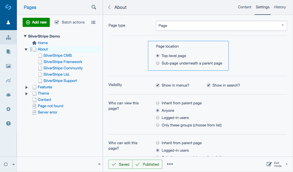- Below the Page location select whether you want the page to appear at the Top-Level, or as a Sub-page underneath a parent page.