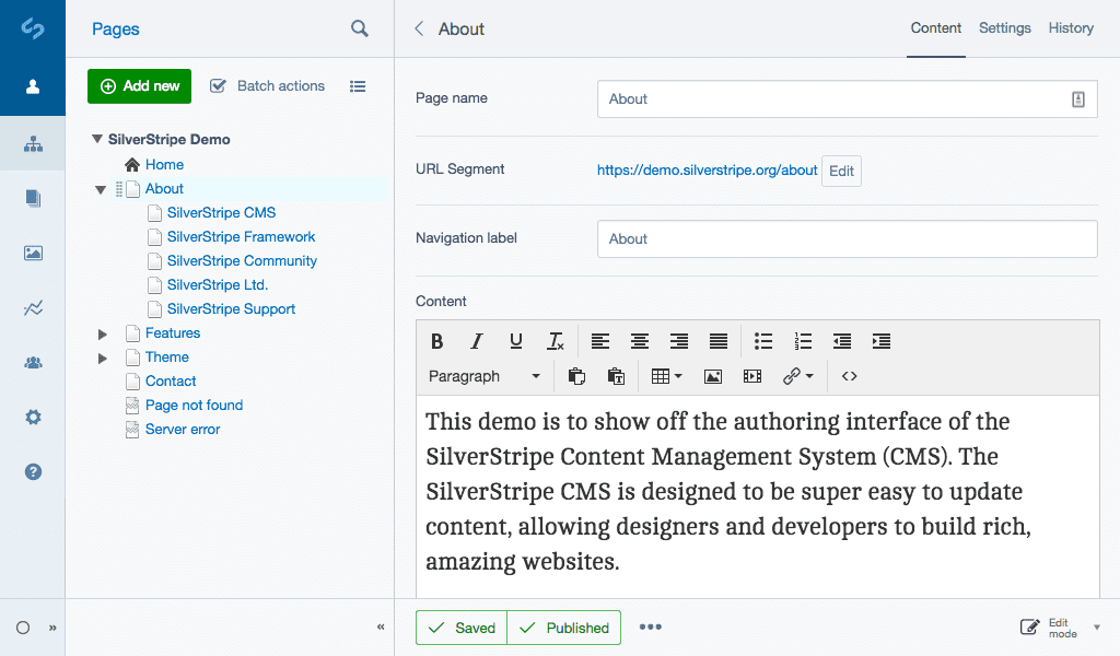 - URL Segment—generated based on the page name, using the words and dashes. Human-readable URLs make a page more easily found by search engines. Well-written URLs can also serve as their own anchor text when copied and pasted as links in forums, blogs, social media networks, or other online venues. Most of the time, the URL that Silverstripe CMS generates will be fine, but you can manually change it if necessary.