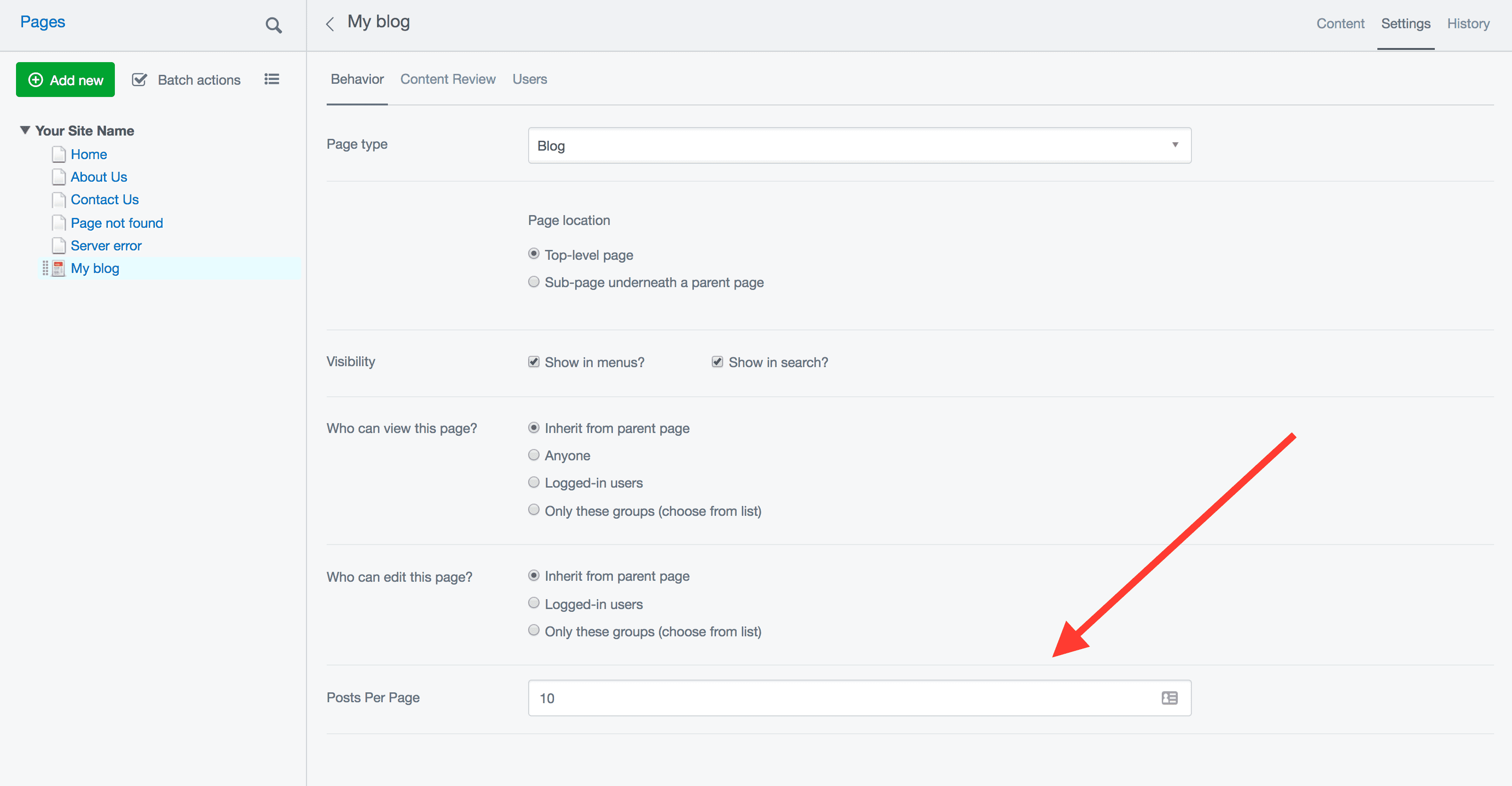 By default your Blog will display ten posts per page. The number of posts per page is configurable via the "Settings" tab. Setting posts per page to zero will disable pagination, displaying all of your posts on a single page.