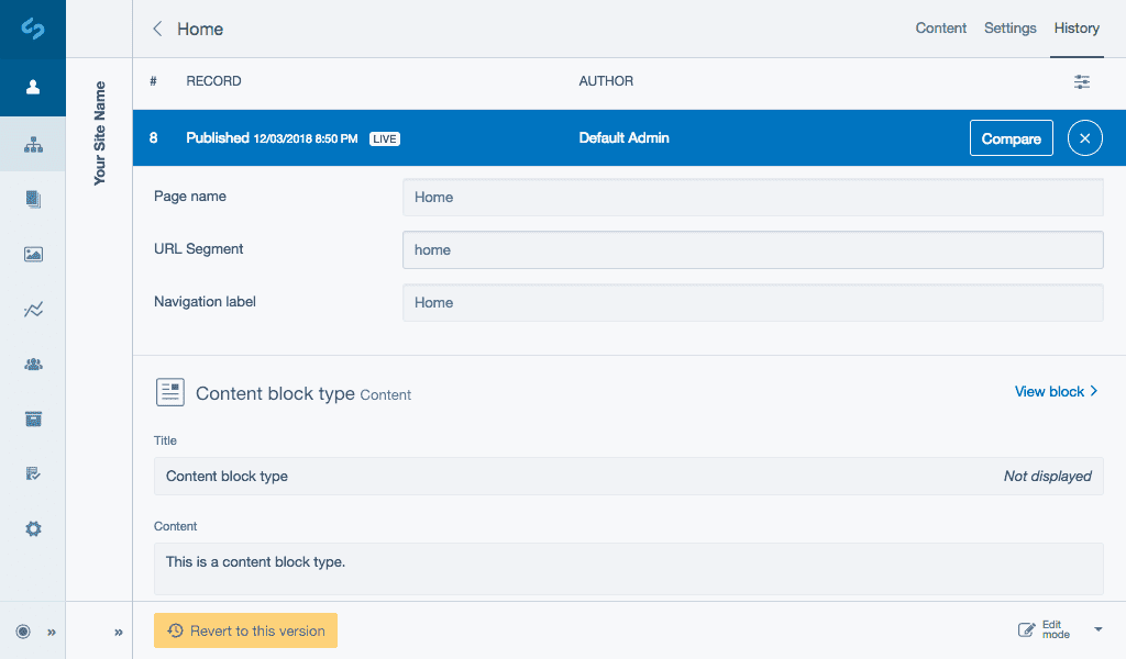 If you want to revert a content block back to an old version, simply choose the record you want from the list and click the button Revert to this version in the bottom Action toolbar.