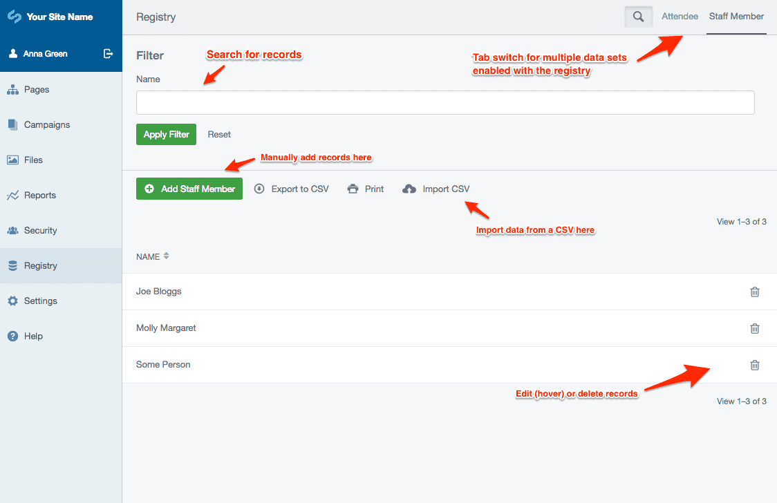 Pagessection of the CMS click "Add new" then select "Registry Page" - Name your page and select from the dropdown "Data Class" the set of data to make public (the set has to have previously been enabled by a web developer).