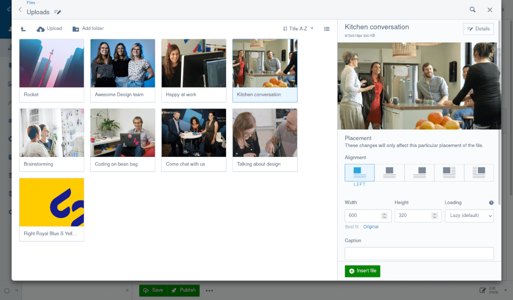 - Click the button Upload. You can also drag & drop files from your computer or select an image from the CMS.