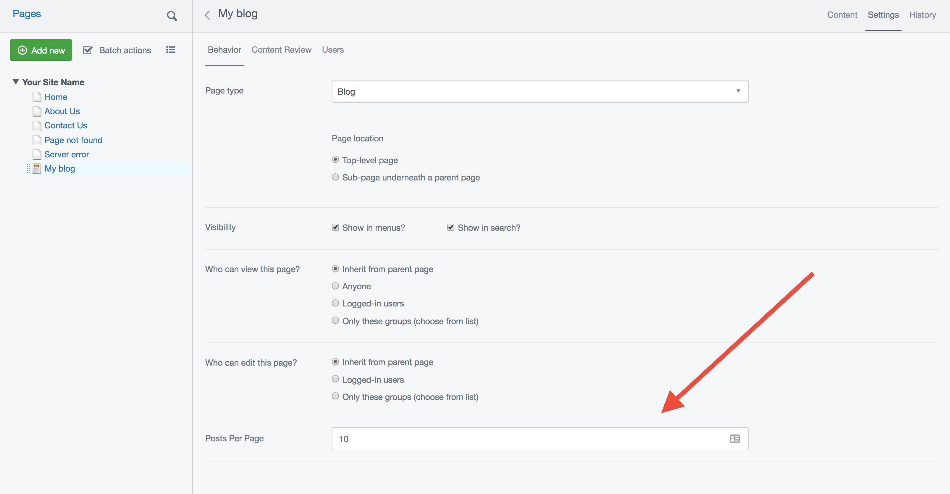 By default your Blog will display ten posts per page. The number of posts per page is configurable via the "Settings" tab. Setting posts per page to zero will disable pagination, displaying all of your posts on a single page.