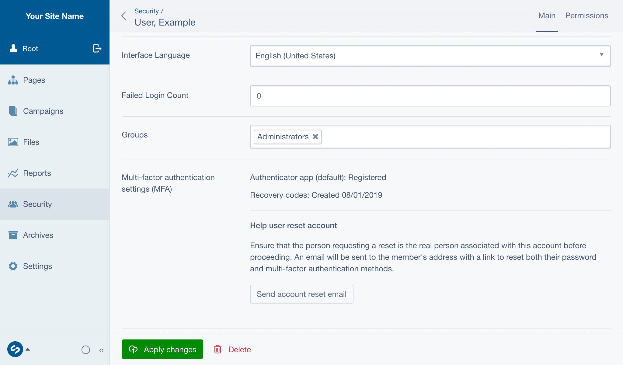- Locate the Multi-factor Authentication settings (MFA) field, and if prompted, re-enter your password to unlock it. Press Send account reset email, and confirm the action in the dialog.