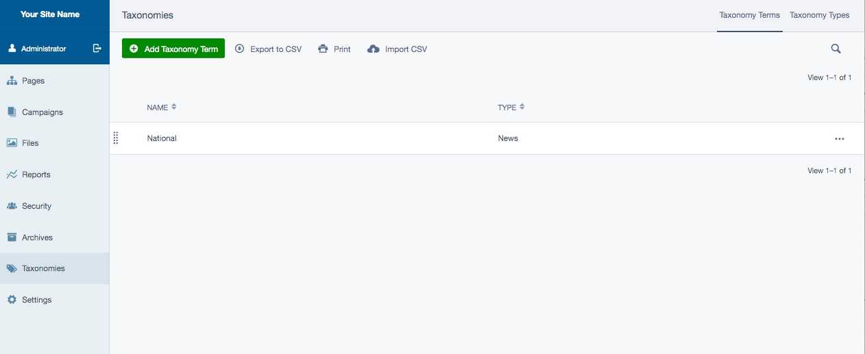 The list that appears contains all existing taxonomies - there could be many in parallel. If the list is empty, you will want to create a Taxonomy Type first. To do so, navigate to the "Taxonomy Types" tab, click "Add Taxonomy Type", specify the name (e.g. "News") and click "Create".